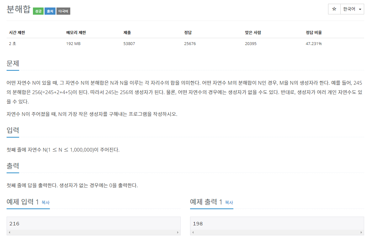 1 이상 1,000,000 이하인 자연수 N이 주어졌을 때 N의 가장 작은 생성자를 구해야 한다.