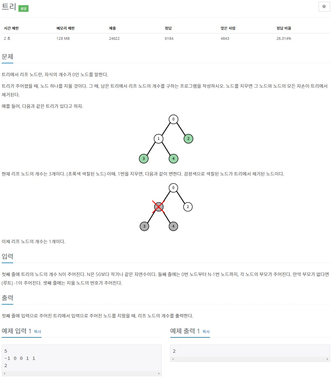얼핏보면 주어진 입력대로 트리를 구성하고, DFS를 통해 리프노드 갯수를 구하는 단순한 문제이다.