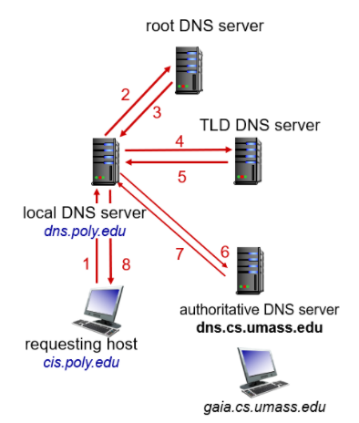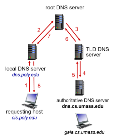 사용자가 Local DNS 서버에 query를 보내면 Local DNS server가 Root name 서버에 query를 보내고, Root 서버는 자신의 서버에 없으면 해당 TLD 서버에 요청한다. 이렇게 재귀적으로 실제 도메인 정보를 가지고 있는 서버까지 query가 이동하여 IP 주소를 얻는 방법이다. 재귀적인 방법은 Root 서버에 너무 큰 부담을 준다는 단점이 있다.