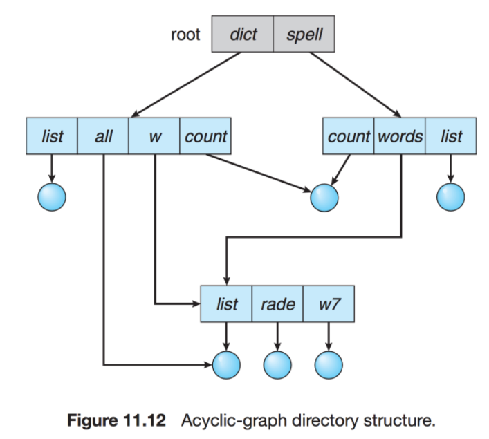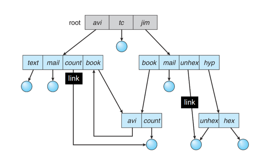 디렉터리들이 서로 파일을 공유할 수 있도록 허용하는 구조. 절대 경로/상대 경로를 사용해 링크라는 디렉터리 항목을 만들 수 있다. 공유된 파일을 삭제하는 경우 빈 곳을 가리키는 고아 포인터(dangling pointer)가 발생할 수 있다.