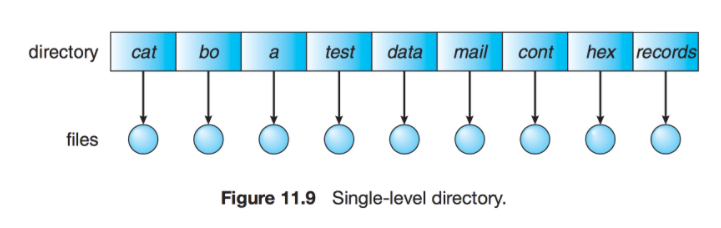 모든 파일이 동일한 디렉터리에서 관리되는 가장 기본적인 구조. 각 파일은 유일한 이름을 가져야 하므로 다수의 사용자가 사용할 경우 제약이 따른다.