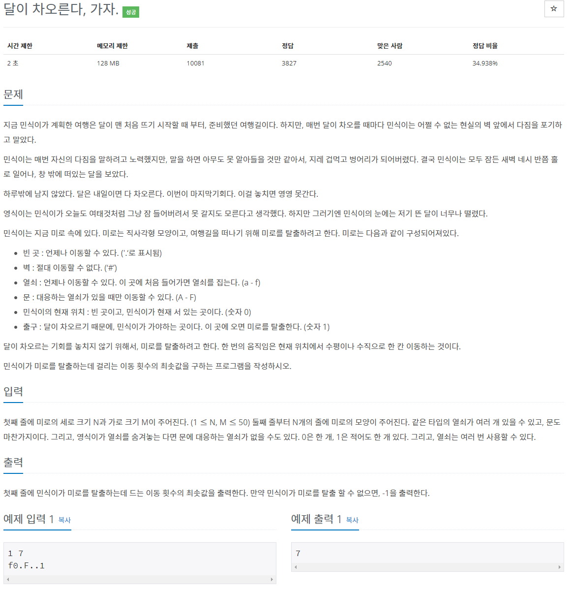 첫째 줄에 미로의 세로 크기 N과 가로 크기 M이 주어진다. (1 ≤ N, M ≤ 50) 둘째 줄부터 N개의 줄에 미로의 모양이 주어진다. 같은 타입의 열쇠가 여러 개 있을 수 있고, 문도 마찬가지이다. 그리고,