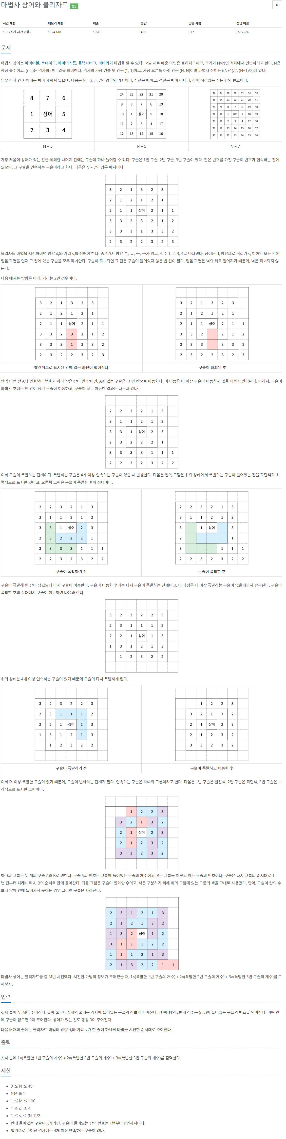 마법사 상어는 파이어볼, 토네이도, 파이어스톰, 물복사버그, 비바라기 마법을 할 수 있다. 오늘 새로 배운 마법은 블리자드이고, 크기가 N×N인 격자에서 연습하려고 한다. N은 항상 홀수이고, (