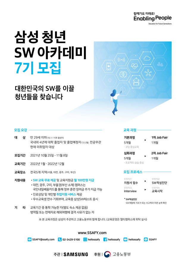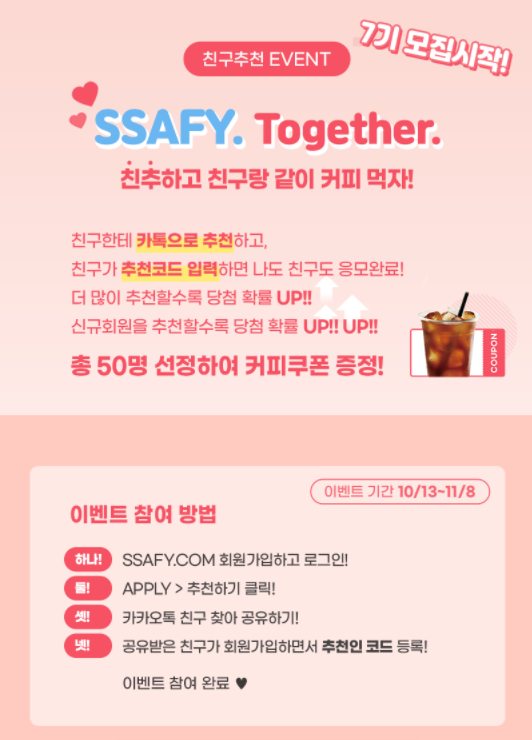 SSAFY 7기 모집을 시작합니다!금번 SSAFY 7기는 역대 최대 규모인 1,150명을 모집합니다SSAFY는 꿈과 열정이 가득한 대한민국 청년들을 기다리고 있습니다. 7기 ! 많